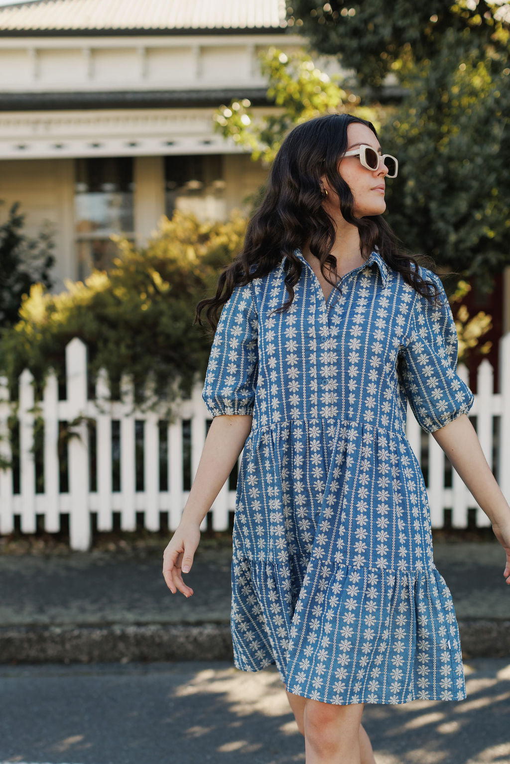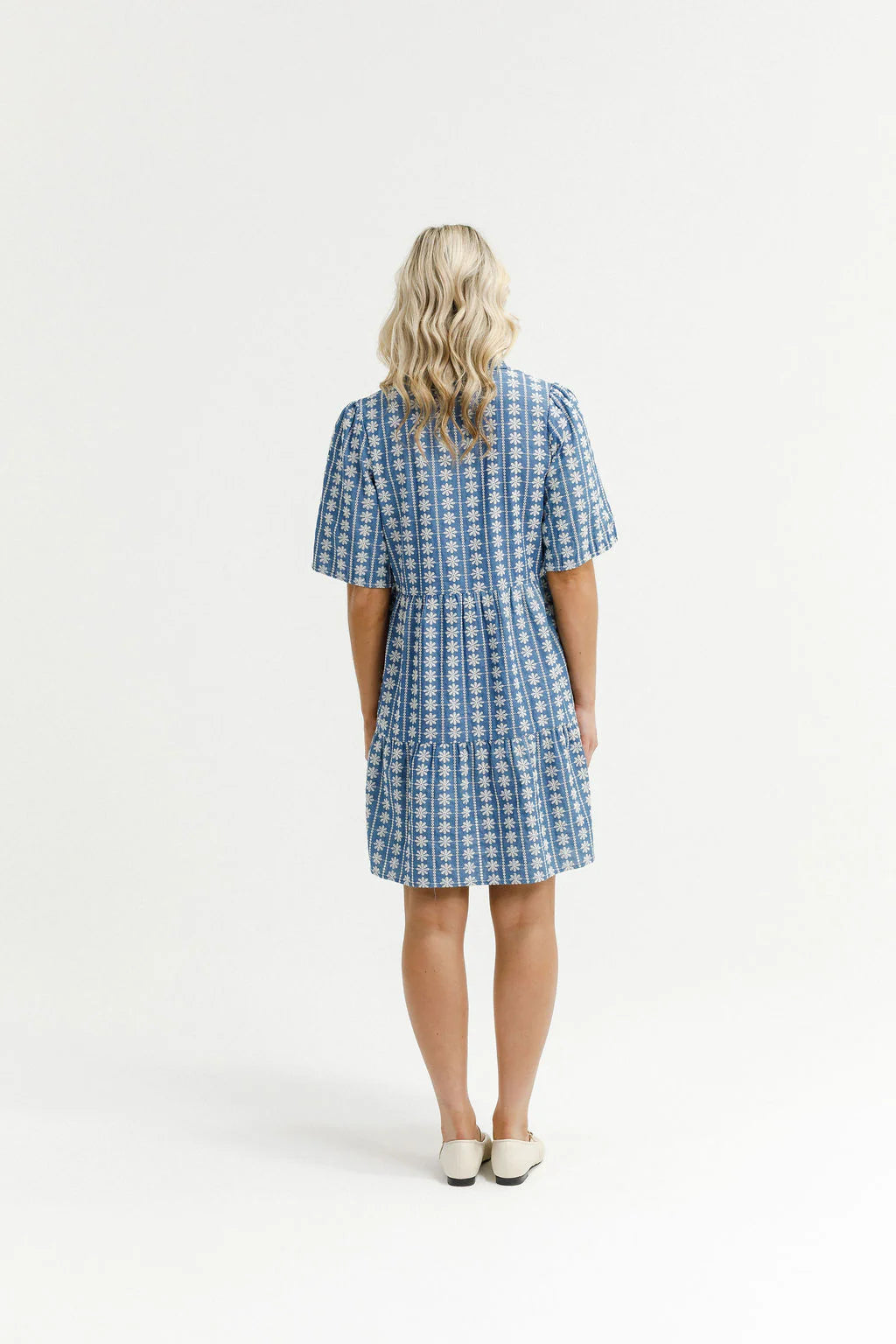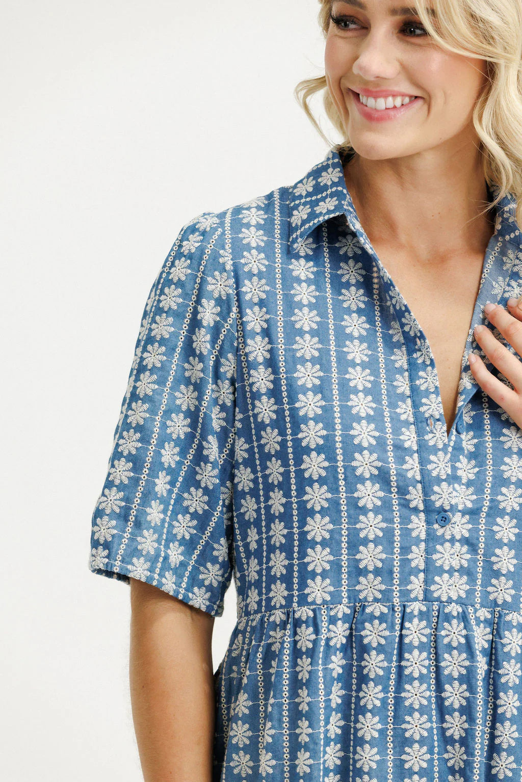 The Khloe Mini Dress is cut from 100% Cotton in our softly embroidered Daisy fabric. Her button-down front keeps it... Read more